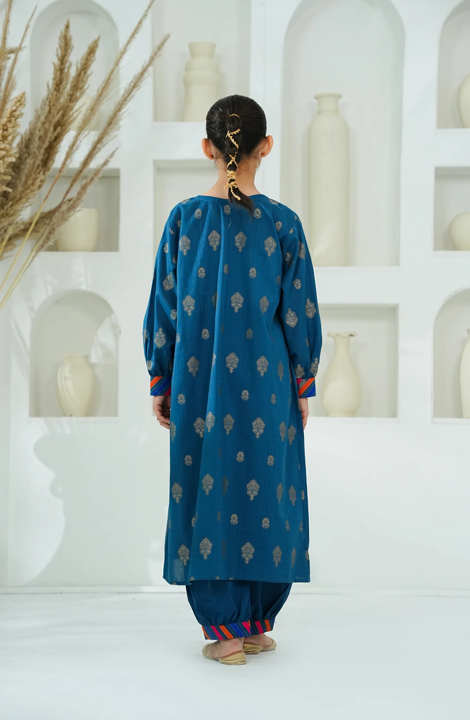 A stitched cotton jacquard set with a Balochi-style handworked shirt and plain trouser with piping perfect for everyday elegance.