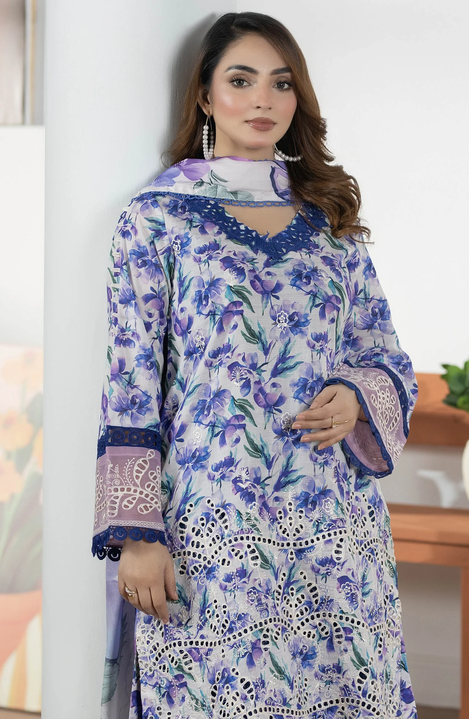 A graceful summer lawn ensemble featuring elegant prints and fine embroidery, paired with a lightweight printed chiffon...