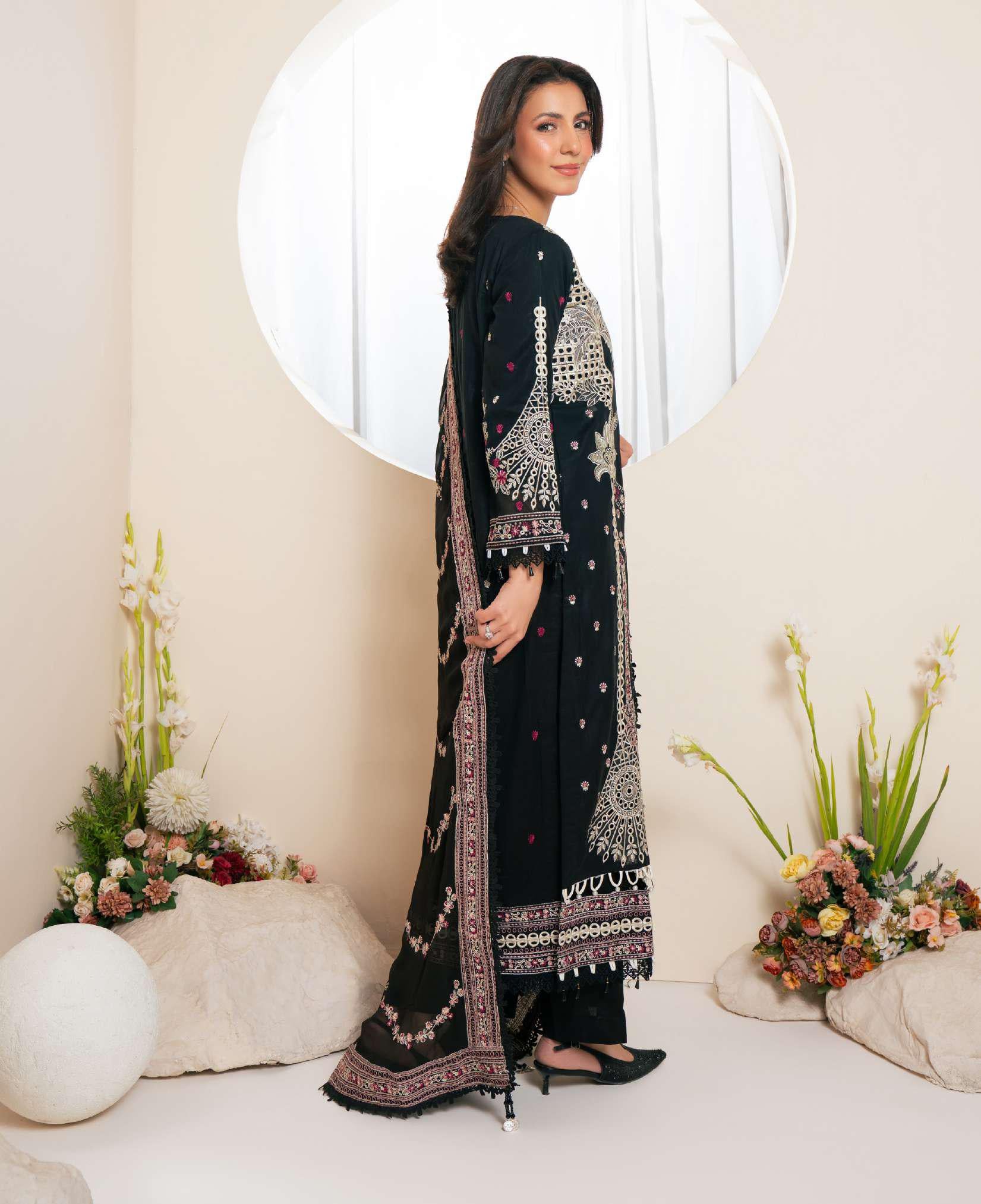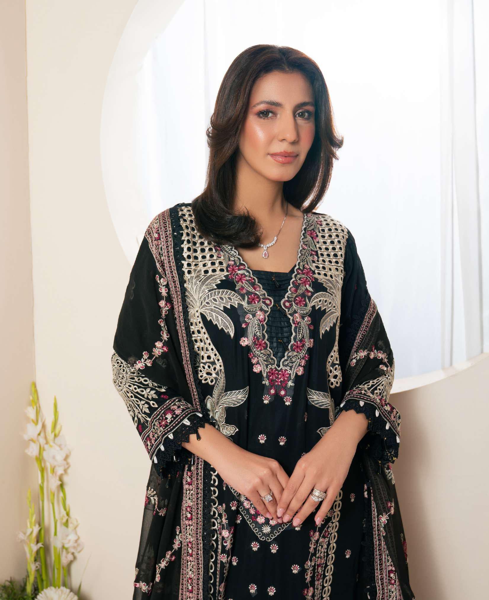 Elegant festive wear featuring fine embroidery on premium fabrics, perfect for special occasions and celebrations.
