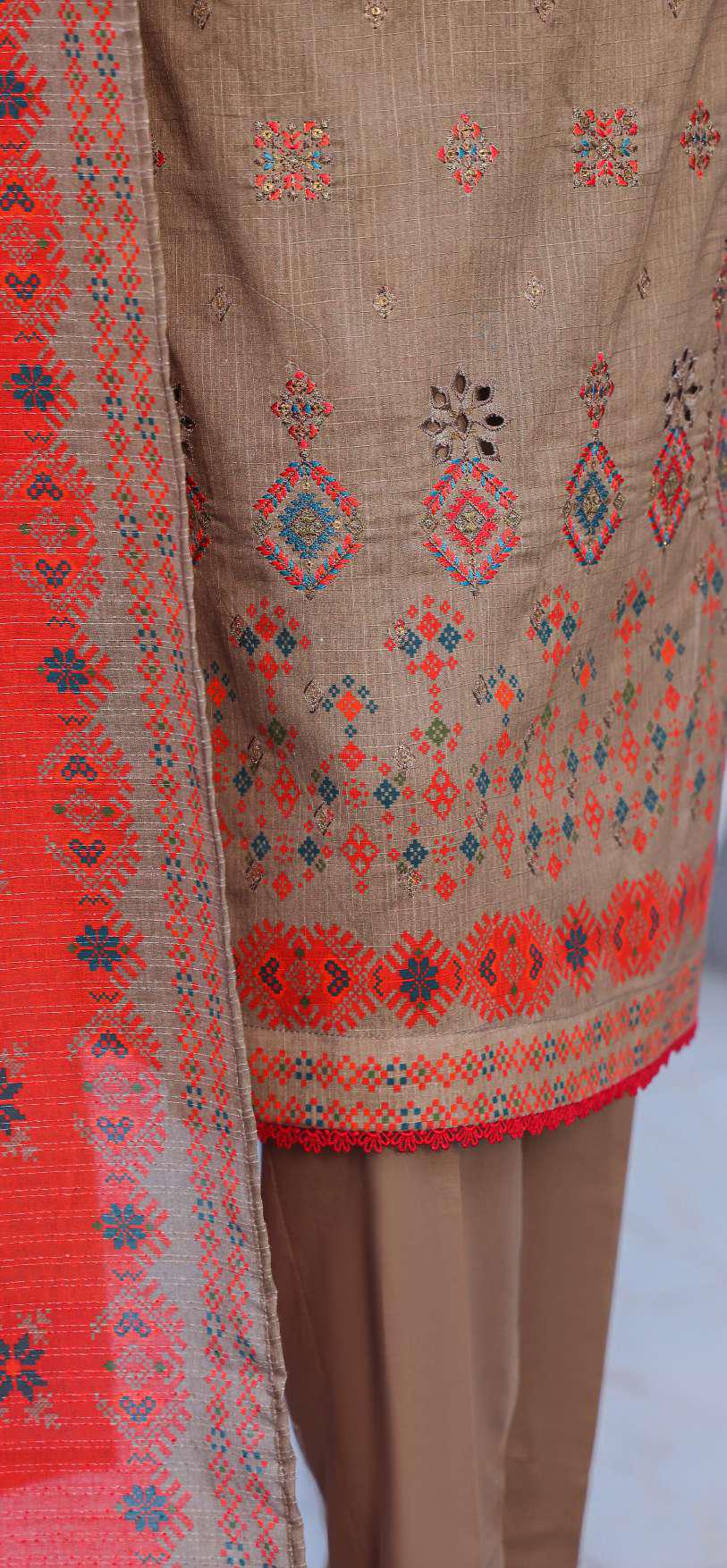 DIGITAL PRINTED CROSS SLUB EMBROIDERED SHIRT DIGITAL PRINTED KARANDI DUPATTA  DYED CAMBRIC TROUSER Note: The color shown...