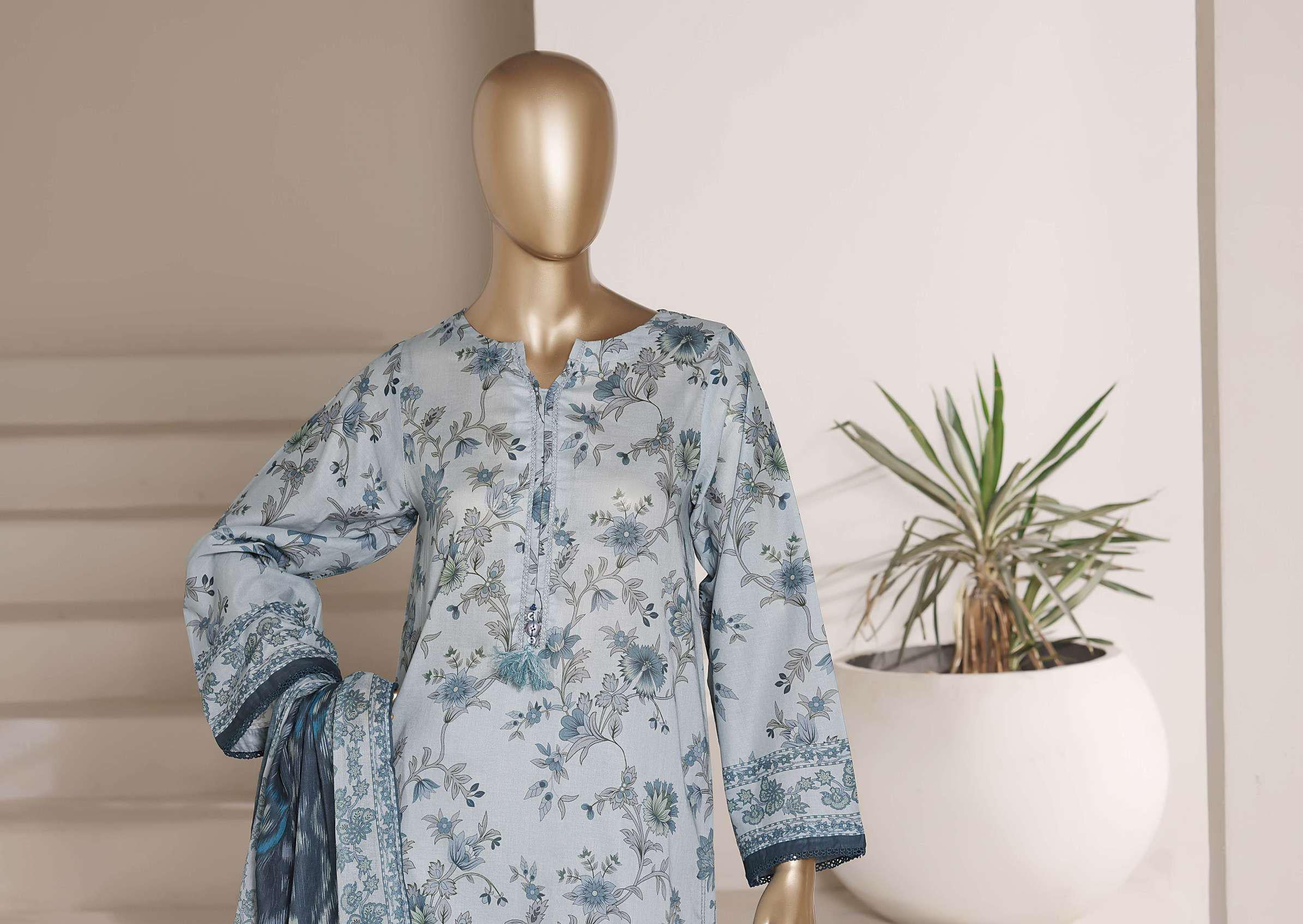 A stylish ready-to-wear luxury lawn printed ensemble paired with a vibrant digital lawn dupatta perfect for a chic and comfortable everyday look.