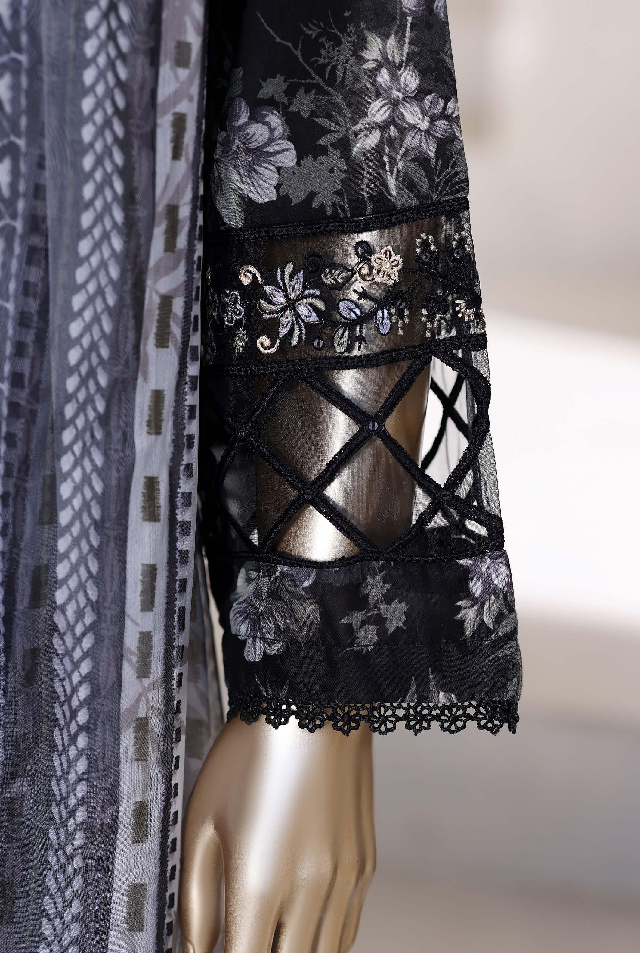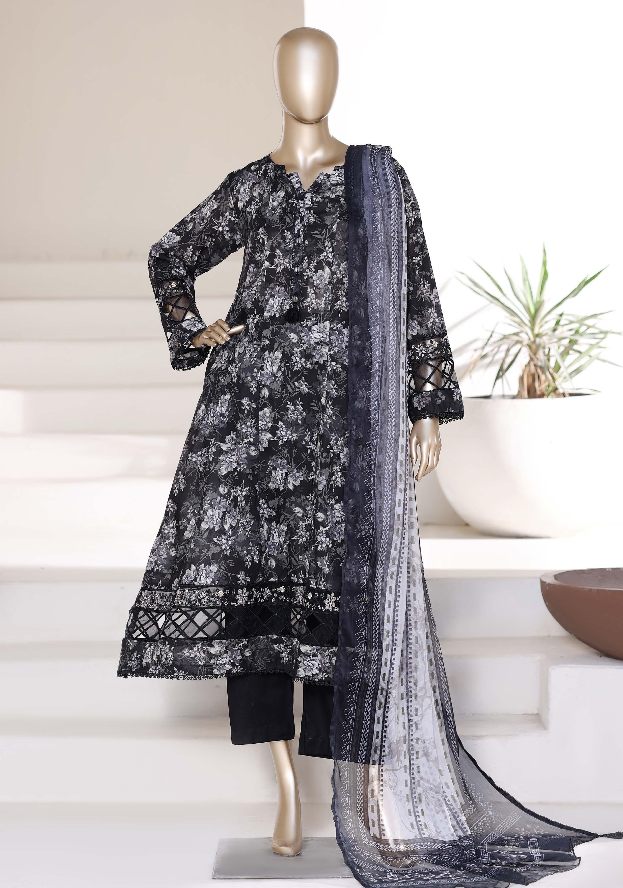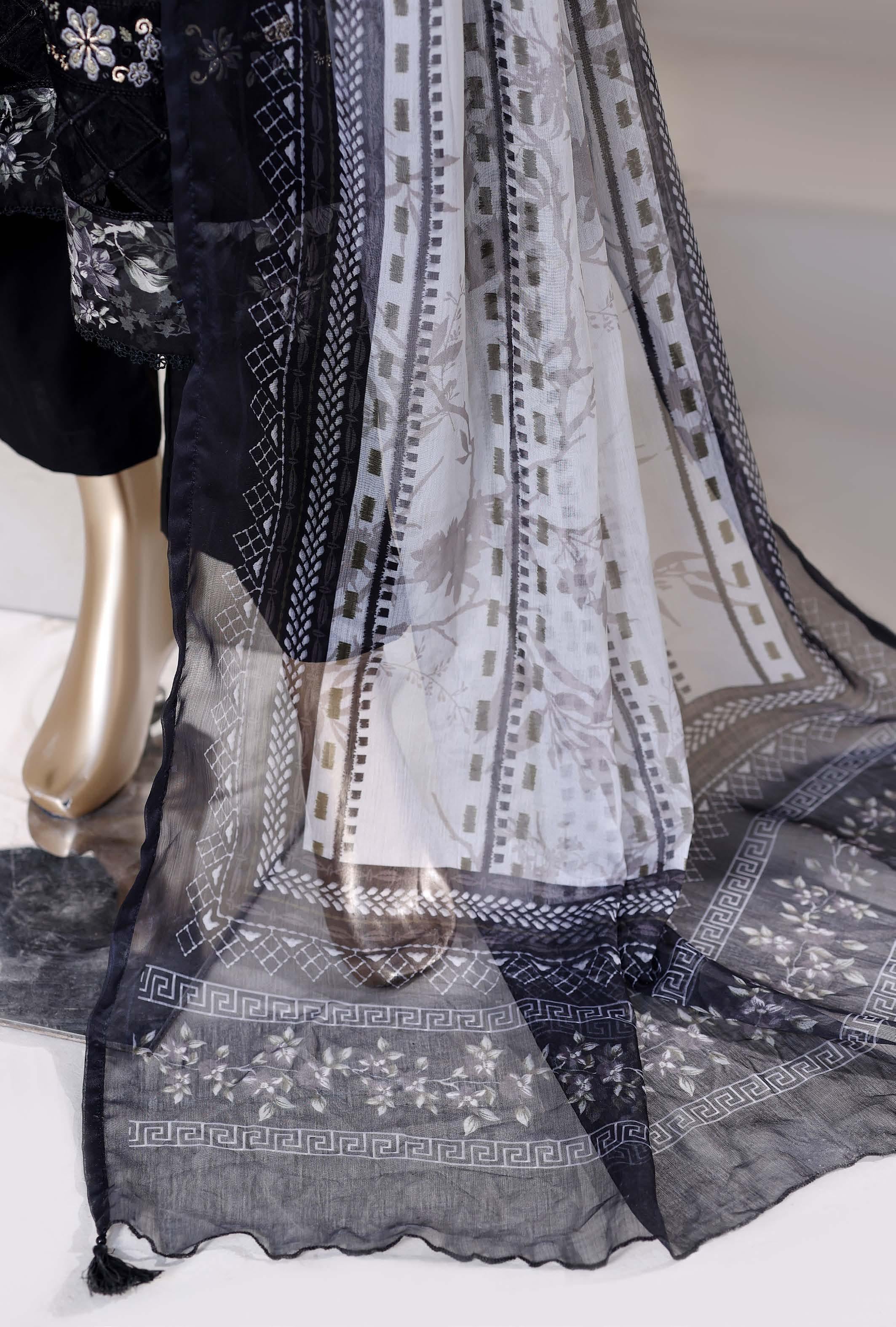 A stylish 3 piece stitched peplum lawn outfit featuring heavy embroidery paired with a digital printed chiffon...