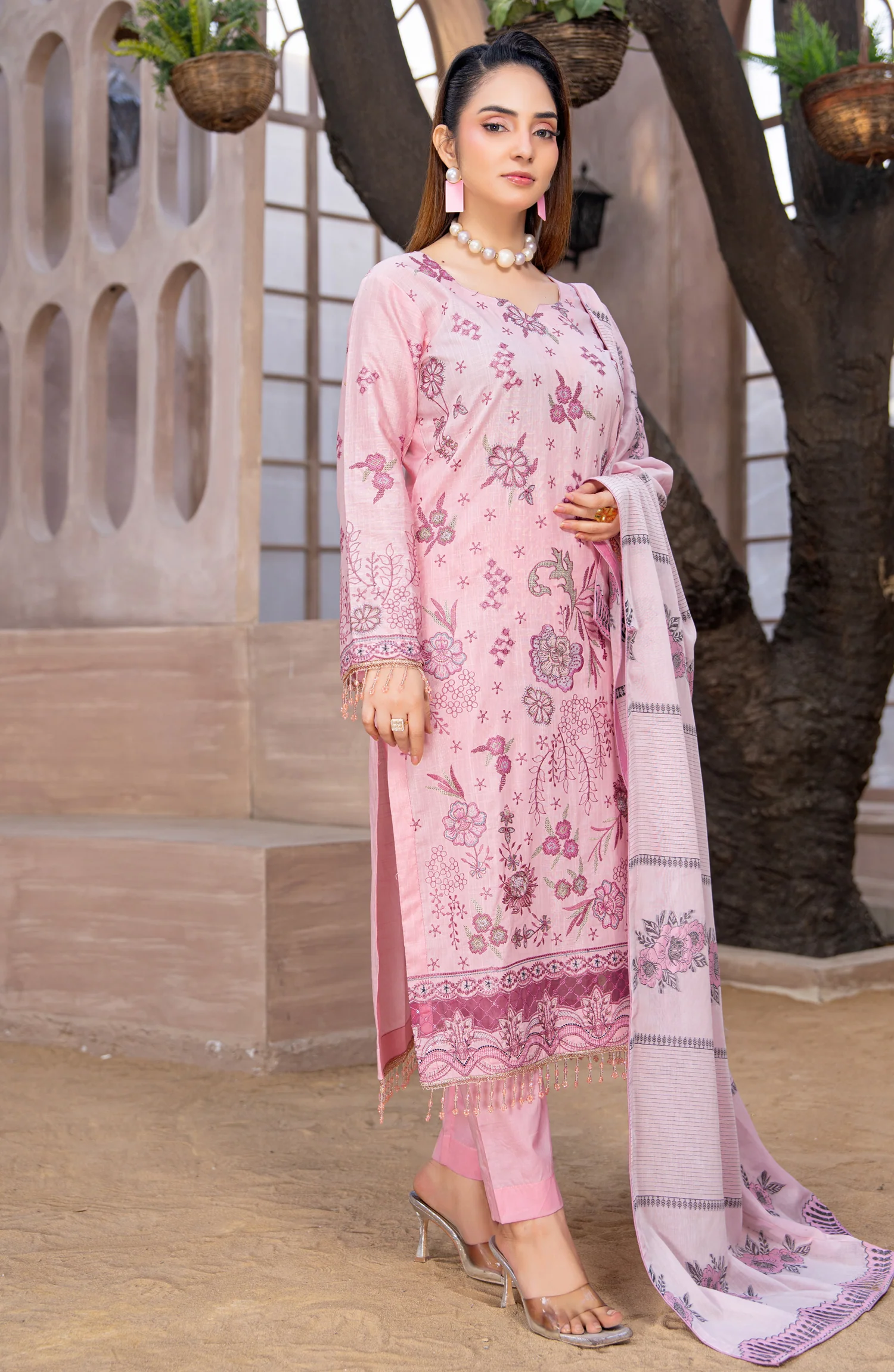 Graceful Summer Luxury with an Embroidered Fancy Slub Shirt and Dyed Yarn Voile Dupatta. Details: Fancy Slub...