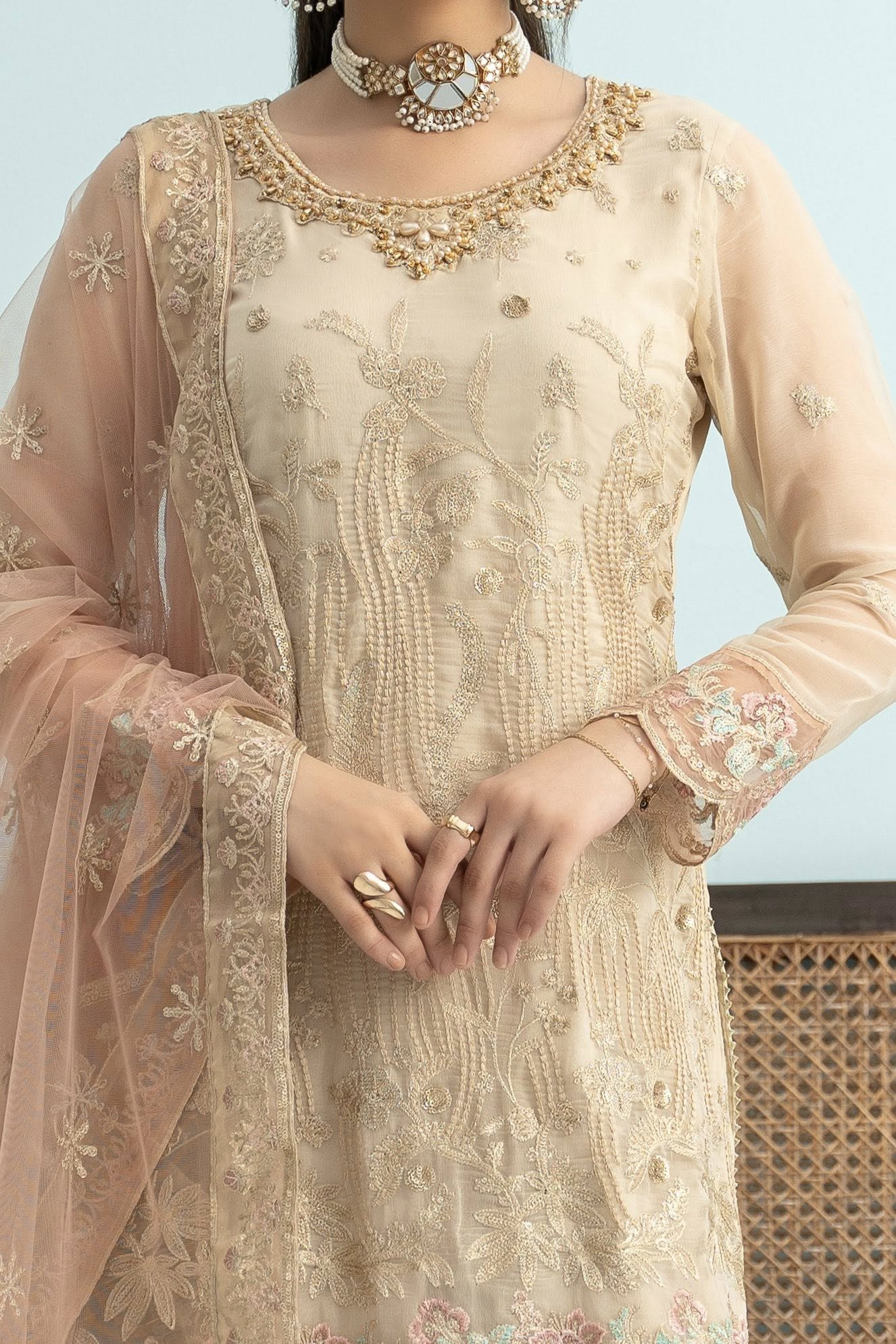 โข Fabric: Embroidered Chiffon Shirt, Embroidered Net Dupatta, Same Dyed Rawsilk Trouser